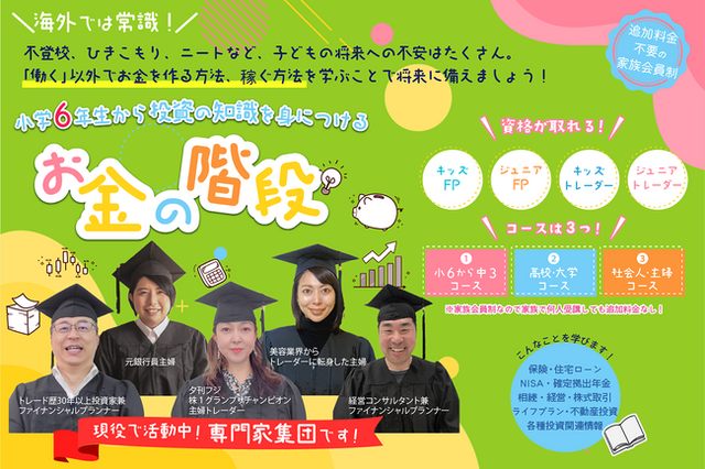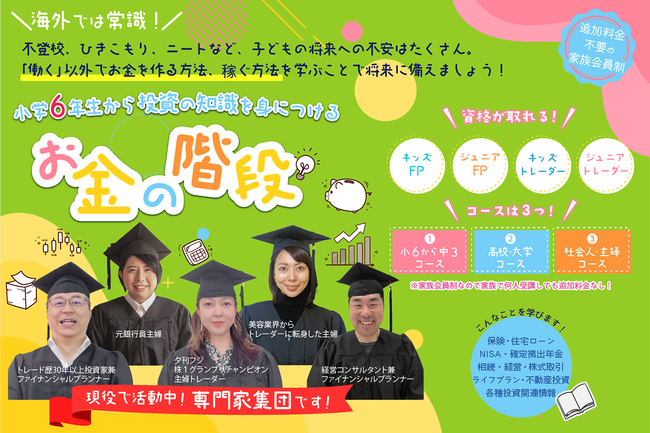 貯金していたら安心という昭和の時代を生きてきた親からは学ぶことができないからこそ、偏った誘導や営業が一切ない各種専門家集団(投資家・トレーダー・FP・経営者等)から体系立てて教わる金融教育のステージが必要ではないでしょうか? 小学生から「投資」の概念を身体に浸み込ませていきます。※講師の生の体験も交えて講義します。