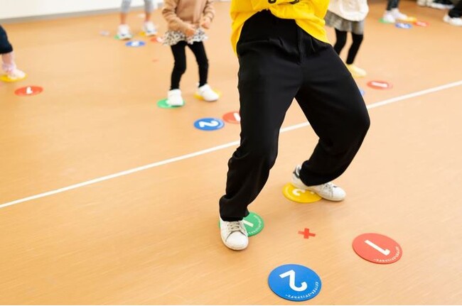 パパイヤ鈴木氏が生み出した「カズフミくん」を使用するカリキュラムです。ベースとなるカズフミくんメソッドを使っています。カズフミくんメソッドは、1から4の数字が書かれた「カズフミくんマット」を順に踏んでいくだけで、誰もが簡単に踊れるようになりま す。ダンスに最も大切な基礎スキルである、下半身の体重移動が自然と身につく、まさにダンスの譜面のようなもの、それがカズフミくんなのです