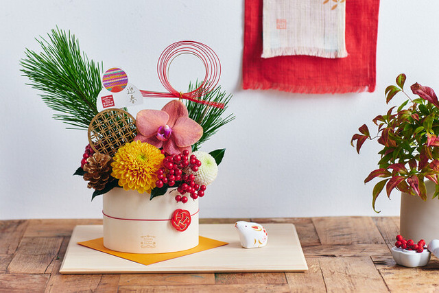 古くから子孫繁栄や不老長寿の象徴とされた菱形。桐でかたどった木箱を花器に、菊や松など、縁起のよい正月花をあしらいました。 2色展開。