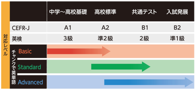 英語力を評価する国際指標「CEFR」(ヨーロッパ言語共通参照枠)のレベルに基づいて基本語彙を精選し、また、チャンクの選定はコーパス(実際に使用された英語をコンピューター分析するための大規模言語データベース)による教科書や入試問題の分析に基づいています。