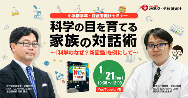 本セミナーでは、主に小学校低学年(1~3年生)のお子様をお持ちの保護者を対象に、受験研究社NEXT LEARNING Labsの研究員の2人が、この学齢のお子様の自然な観察力・考察力の育成を目指した「家族の科学的な対話」のしかたについて対話します。