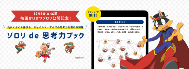 総合教育サービス事業の株式会社やる気スイッチグループ(東京・中央区、代表取締役社長:高橋 直司)が展開する知能育成(知育)と受験対策の幼児教室「チャイルド・アイズ(R)」では、『映画かいけつゾロリ ラララ♪スターたんじょう』が2022年12月9日(金)に公開されるのを記念し、スペシャルコラボレーションしたオリジナル問題集「ゾロリde思考力ブック」の無料ダウンロードを開始いたしました。チャイルド・アイズならではのIQがぐんぐん伸び思考力を高める問題を厳選してご用意、各問題のかいけつのためのヒントをゾロリが出してくれます。2023年3月31日(金)までの期間限定です。