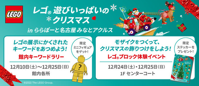 三井不動産商業マネジメント株式会社(本社:東京都中央区、代表取締役社長:大林 修)が運営する ららぽーと名古屋みなとアクルスは、 2022年12月10日(土)~12月25日(日)の期間にレゴジャパン株式会社とのタイアップイベント「レゴ(R)遊びいっぱいのクリスマス」in ららぽーと名古屋みなとアクルス を開催します。