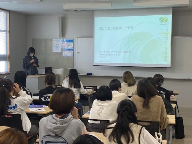 今年度は、企業を訪問して実際の仕事の様子を学ぶ観察学習とインターンシップを組み合わせた「沖縄女子短期大学型ジョブシャドウイング」を実施しており、その事前学習カリキュラムのひとつ「職業人講話」に、仕事と育児の両立を実践している当社の女性社員が講師として登壇し、多くの学生が参加しました。