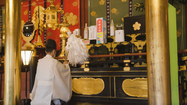 当日は、受験生応援の特別巨大パッケージの森永ラムネを御本殿前にて神職にお渡しし、御神前にお供えいただきました。代表者3名は手水の儀にて身を清め、御本殿の中へ。参拝者をお祓いする修祓が行われた後、マーケティング本部菓子マーケティング部部長が代表して玉串拝礼し、天神さまへの奉納式が無事に執り行われました。
