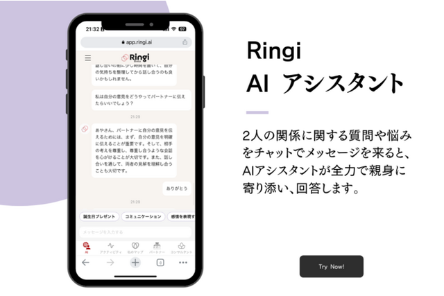 株式会社Ringi(東京都渋谷区、代表取締役社長兼CEO:カラタイエヴ・イエルザン)は、大人カップル向けAIアプリのベータ版に、AIとチャットでやりとりができる「リレーションシップAIアシスタント」機能を、正式版に先駆け、日本語と英語で同時に実装したことをお知らせいたします。