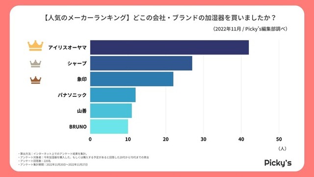 「Picky’s」は、インターネットショッピングにおいて、購入前に試せない・選ぶべきものがわからないという課題の解決を目標に、あらゆる商品のおすすめランキングや検証レビューを紹介するサイトです。このたびPicky’s(https://rentry.jp/note/)では、加湿器を買う際に意識していることや人気のメーカー・ブランドなどをインターネット上でアンケート調査を行い、ランキングを作成いたしましたので発表いたします。