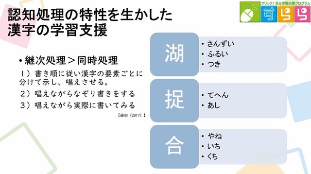 「継次処理」は順序立てて教わるのが得意で、耳から得た情報で理解が深められる傾向があるため、漢字を覚える際は書き順に従い漢字の要素を声に出して唱えながら書く勉強方法を取り入れると覚えやすくなります。