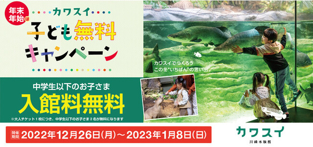 カワスイ 川崎水族館(所在地:神奈川県川崎市、館長:岩岡千香子、以下カワスイ)では、2022年12月26日(月)~2023年1月8日(日)の期間、「カワスイ 子ども無料キャンペーン」第2弾の開催が決定いたしました。期間中は、お子さまとご家族がよりカワスイをお楽しみいただけるようなコンテンツを、盛りだくさんでご用意いたします。