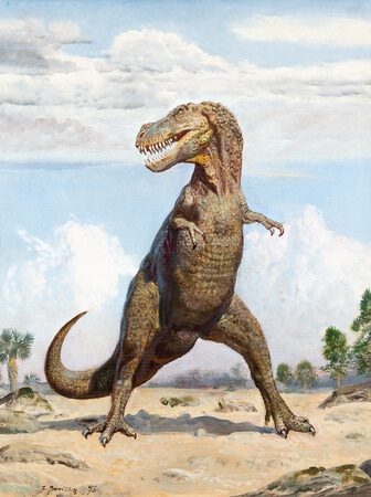 チャールズ・R・ナイトは、19世紀末から20世紀前半にアメリカで活躍しました。もともと野生動物画家だったナイトは、生物学的知見に基づき、恐竜をいきいきとした姿で描き現代に蘇らせました。恐竜を躍動感あふれる姿でとらえた≪ドリプトサウルス(飛び跳ねるラエラプス)≫は恐竜画における記念碑的イメージです。ズデニェク・ブリアンは、20世紀中盤から後半にかけてチェコで活動。当時の化石発掘の中心地であったアメリカから遠く離れた東欧圏は、直接化石を研究できる機会が限られていました。その環境にありながら、ヨーロッパ美術のリアリズムの伝統を踏まえた彼の作品は、強い説得力を持つものとして国際的に高く評価されました。パレオアートの2大巨匠である彼らの作品は、日本の図鑑などにも模写され、恐竜イメージの普及に大きな影響を与えました。かつての少年少女が胸おどらせ夢中で読んだ恐竜図鑑―そこに描かれた憧れの恐竜画のオリジナルが、本展で一堂に会します。