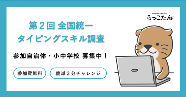 自治体向けサービスを開発する株式会社ミラボ(本社:東京都千代田区、代表取締役:谷川一也、以下「ミラボ」)と、情報モラル教育・プログラミング教育を手がける株式会社教育ネット(本社:神奈川県横浜市、代表取締役:大笹いづみ、以下「教育ネット」)は、2022年12月1日より 共同開発したクラウド型デジタルAI教材「らっこたん」を使用した「第2回全国統一タイピングスキル調査」の無料参加自治体・小中学校の募集を開始いたしました。