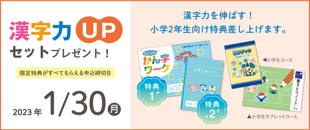 Z会の通信教育では、2023年度小学2年生向けコースにご入会いただいた方に「漢字力UPセット」を差し上げるキャンペーンを【2022年11月28日(月)~2023年1月30日(月)】まで実施しています。