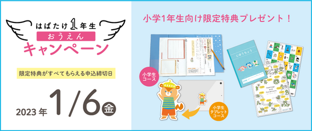 現在、ご受講のコースに応じた特典を差し上げる「はばたけ1年生おうえんキャンペーン」を【2022年11月28日(月)~2023年1月6日(金)】まで実施しています。