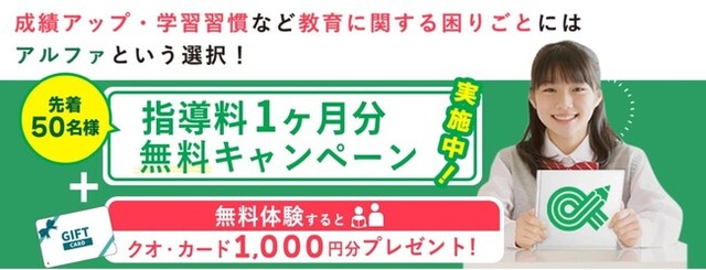 全国でプロ家庭教師による質の高い学習指導を行う『家庭教師のアルファ』では、できる限りご負担を少なく学習を始めていただくために、ただいま先着50名様に、指導料が1ヶ月分無料になるキャンペーンを実施中です!