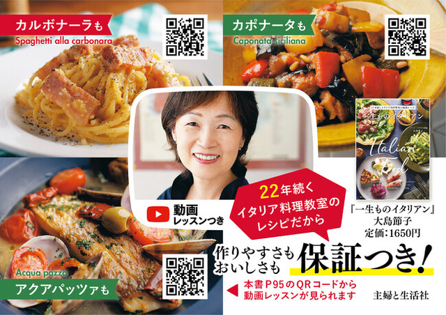 本書95ページには、料理教室でも生徒に大人気の7レシピの動画QRコードとURLを掲載。