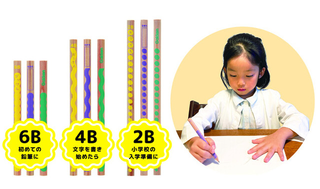幼児期では、クレヨンやマーカーなどの太軸の筆記用具から「書く」ことがスタートします。そこから学習の基礎になる運筆力を上げる手助けとなるのが、幼児の手でも握りやすい太い軸の三角鉛筆。お子さまの手に合わせた鉛筆の長さ、芯の濃度3種(6B、4B、2B)をラインアップ!