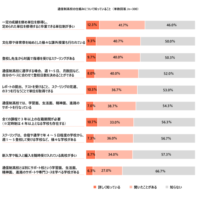一方、知っている方が少なかったのは、「通信制高校とは別にサポート校という学習面、生活面、精神面、進路のサポートや専門コースを学べる学校がある」計33.3%、「新入学や転入と編入を随時受け入れている高校が多い」計42.7%でした。通信制高校の制度などに関してはまだまだ認知が高くないようです。