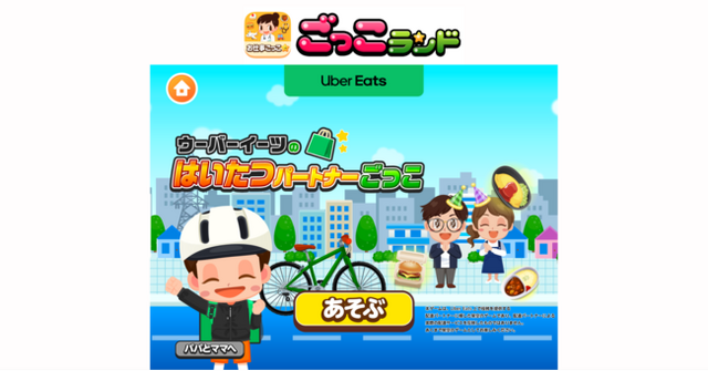 Uber Eats Japan 合同会社が運営する Uber Eats(ウーバーイーツ)は、タップ一つで世界中の人々にお好きな料理や食品、日用品などをお届けするオンラインデリバリーサービスです。日本では、2016年9月にスタートし、現在では47都道府県、180,000以上の登録店舗と提携し、デリバリーのエリア、バリエーションを拡大しています。本ゲームを通して、子どもたちにウーバーイーツの配達をより身近に感じていただきたいという想いから、『ごっこランド』への出店が実現しました。