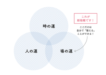 運命は「時」「場」「人」で展開します。特に肝心なのは「人の運」。金運も仕事運も「人」が運を運びます。いかに、時と場と人を一致させるかが重要なのです。