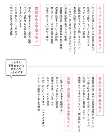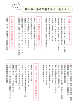 玄関、トイレ、リビング、キッチン、クローゼット等、ポイントごとに1日5分でできる断捨離を解説します。