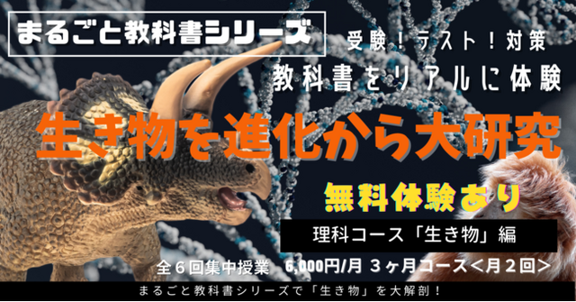まるごと教科書シリーズの当授業では、進化の過程から学ぶことで、より深く生物学に興味を持つことができるようになります。たくさんの面白い進化を遂げた生物もたくさん登場し、生物の成り立ちを知ることで、魚類、両生類、は虫類、鳥類、哺乳類生物について詳しく学んでいきます。