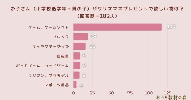 「お子さん(小学校低学年・男の子)がクリスマスプレゼントで欲しい物は?」とアンケート調査した結果、1位は『ゲーム、ゲームソフト』でした。