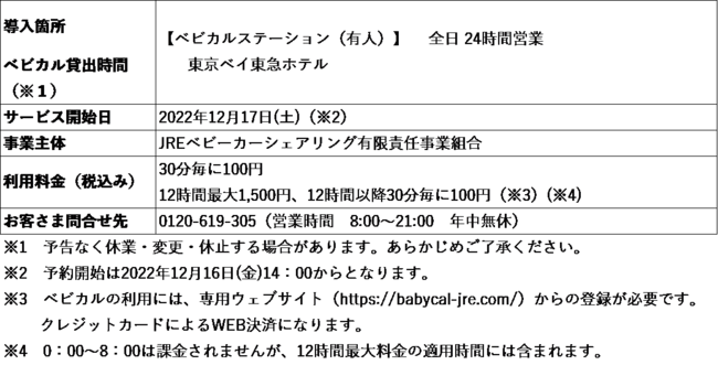 ◆今回、株式会社東急ホテルズが運営するホテル「東京ベイ東急ホテル」でサービスを開始します。ベビカルの開始により、子育て世帯の快適なおでかけやご旅行をサポートいたします。