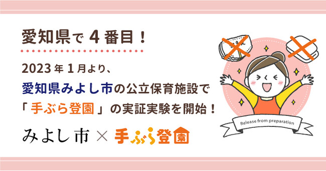 BABY JOB株式会社(本社:大阪府大阪市、以下当社)は、愛知県みよし市の公立保育施設において、当社とユニ・チャーム株式会社が提供する、保育施設向け紙おむつの定額サービス「手ぶら登園」の実証実験を、2023年1月より2か月間実施することをお知らせします。愛知県内の公立保育施設では、豊橋市、半田市、豊田市に続いて4番目の実証実験になります。