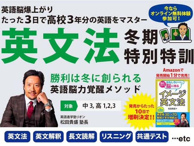 子どもから大人まで全世代の共育(教育)事業を手がける株式会社エブリオン(本社:千葉市、社長:松田 貴盛)が運営する英語進学塾「英語進学塾リオン」がこの冬に開催する『たった3日で高校3年分の英文法がマスターできる冬特訓』が、全国の受験生から申し込み殺到しています。