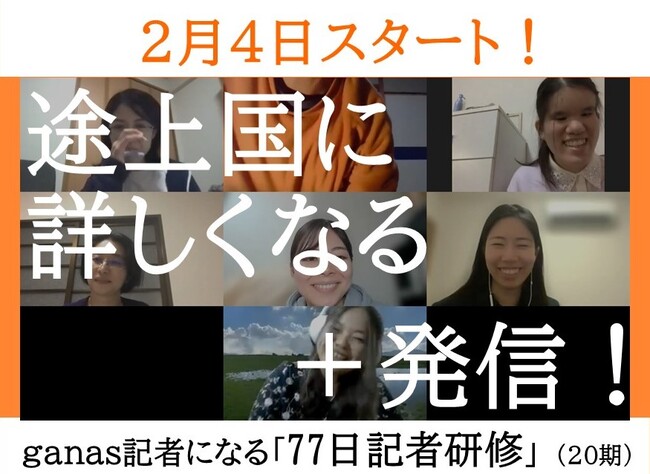 途上国・国際協力に特化した非営利メディア「ganas」を運営するNPO法人開発メディアはこのほど、ganasの記者を育てるプログラム『77日記者研修』(20期)の参加者の募集を始めました。途上国に関心のある方、ganasの記者になって本格的な記事を書き、それを発信してみませんか? 途上国で暮らした経験のある社会人はもとより、春休みに本格的なインターンをしたいメディア志望の大学生にも最適。