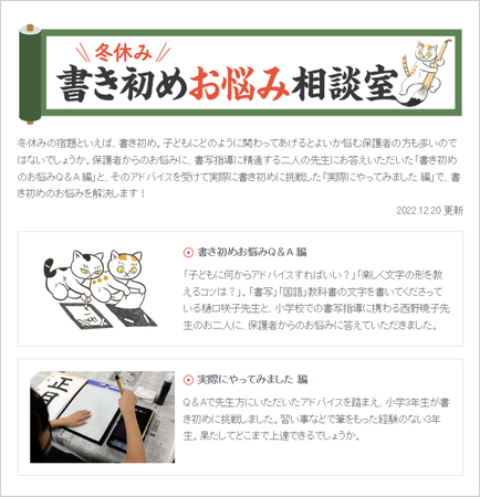 冬休みの宿題として取り組むことの多い「書き初め」。昨年、ご好評いただいた「冬休み 書き初めお悩み相談室」がリニューアルしました。保護者からのお悩みに、光村図書「書写」教科書編集委員がお答えする「書き初めお悩みQ&A編」に、今年は「実際にやってみました 編」がプラス。Q&A編のアドバイスをもとに、子どもと保護者が実際に書き初めに挑戦した様子をレポートします。