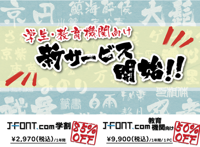 今回J-Font.comでは、教育現場における設備用の「教育機関向けプラン」、学生の個人PC用の「学生向け割引プラン(学割プラン)」、2つの割引プランをご用意いたしました。教育機関向けプランは通常価格の50%OFF、学割プランは更に割引の85%OFFにてご利用いただけます。