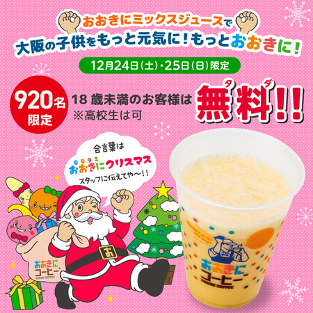 大阪・おおきにコーヒー心斎橋アメリカ村店にて12月24日(土)25日(日)のクリスマスの2日間、18歳未満のお客様を対象に920名様限定 “おおきにミックスジュース”をプレゼント!
