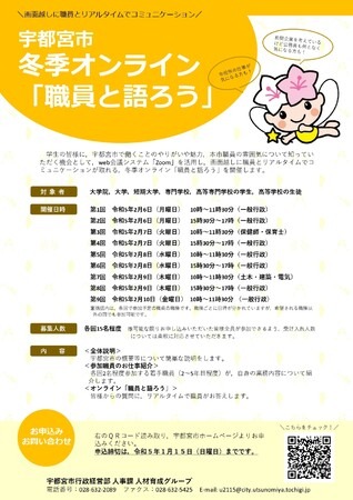 宇都宮市では、学生の皆様に宇都宮市で働くことのやりがいや魅力,本市職員の雰囲気について知っていただく機会として,「Zoom」を使用し,画面越しに職員とリアルタイムでコミュニケーションが取れるインターンシップ代替プログラム『冬季オンライン「職員と語ろう」』を開催します。