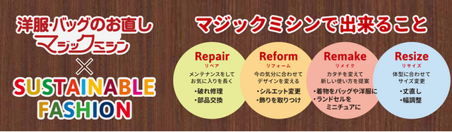 「お直しドリームキャンペーン」とは、7月4日が「ファッションお直しの日」(一般社団法人日本記念日協会認定)に制定された記念に、「マジックミシン」「リアット!」が持つのお直しの技術を通じて、でお客さまお気に入りのもの、大切なものをお直し修理、リメイクして生まれ変わらせたいというお客さまのファッションに関するのお直しの夢を叶えるお手伝いをさせていただくキャンペーンです。