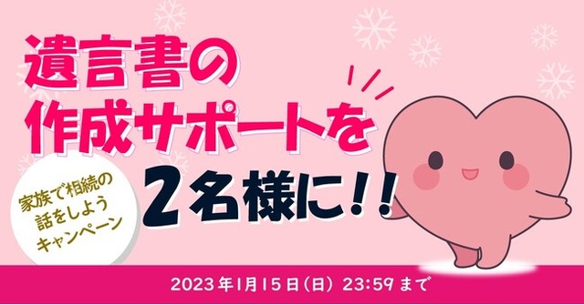 G1行政書士法人が受付窓口と相続事務を担う遺産相続手続まごころ代行センター(東京都千代田区・大阪府大阪市)は、年末年始に家族が集まるのをきっかけに、「家族で相続の話をしようキャンペーン」を実施いたします。ご応募いただいた方から抽選で2名様に、相続専門の行政書士による「遺言書作成サポート」を無料でプレゼントいたします。