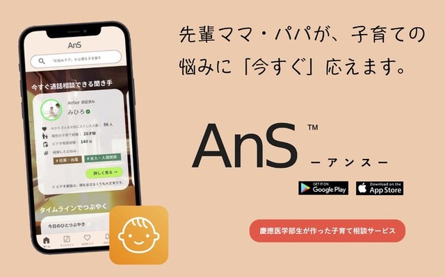 『AnS アンス』は育児中のお母さまやお父さまが、同じような悩みや経験をされた先輩ママ パパ、そして保健師や臨床心理士などの専門家に「今すぐ」相談できるスマホアプリです。(※ 専門家への相談機能は来年追加予定です)