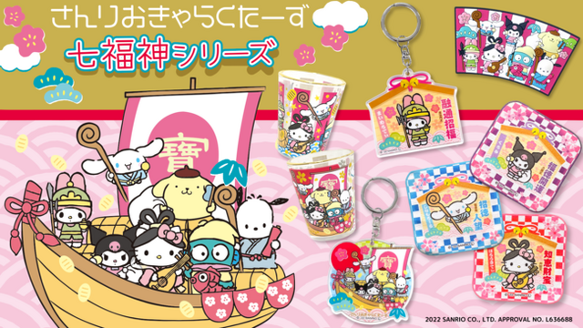 サンリオキャラクターズ七福神シリーズは、『知恵財宝、愛嬌縁結びの徳があるといわれている「弁財天(べんざいてん)」ハローキティ』、『融通招福の神として信仰されている「毘沙門天(びしゃもんてん)」マイメロディ』、『財宝、福徳開運の神様として信仰されている「大黒天(だいこくてん)」クロミ』、『漁業の神、特に商売繁昌の神様としても信仰されている「恵比寿天(えびすてん)」ハンギョドン』、『笑門来福、夫婦円満、子宝の神として信仰されている「布袋尊(ほていそん)」ポムポムプリン』、『長寿延命、富貴長寿の神として信仰されている「寿老人(じゅろうじん)」ポチャッコ』、『招徳人望の神様として信仰されている「福禄寿(ふくろくじゅ)」シナモロール』が、「寶(たから・宝)」と書いてある帆を上げた宝船に乗り、米俵やお宝を積んで福を運んでいます。これから訪れる新春にぴったりなおめでたいデザインです。