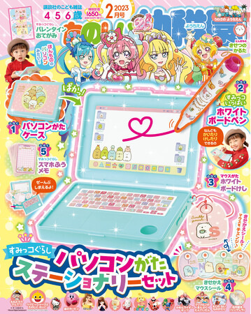 4・5・6歳向け講談社こども雑誌『たのしい幼稚園』2月号の付録は、本物みたいなパソコンの形がかわいい! 「すみっコぐらし パソコンがたステーショナリーセット」です。寸法やボタンなど細部にまでこだわったデザインで本物のパソコンを忠実再現! 蓋を開くと、ケースの内側がホワイトボードになっていて、ホワイトボードペンで楽しくおえかきをすることができます。