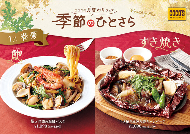 1月のメニューには、爽やかな香りとほろ苦い風味が特長の “春菊”を使用した商品をご用意しました。鮑(あわび)と春菊が主役の和風パスタは、魚介の旨みを春菊のほろ苦い味わいが引き立てる一品です。すき焼き風に仕上げたココス定番の包み焼きハンバーグでは、甘辛いタレを合わせた春菊や豆腐、糸こんにゃくなどの具材と一緒にジューシーなハンバーグをお楽しみいただけます。