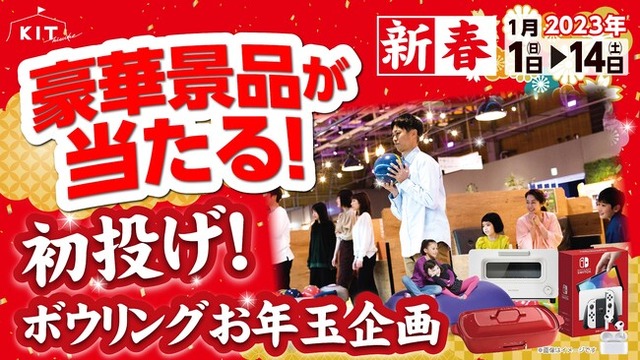 2023年1月1日(日)~1月14日(土)にキスケKIT(キット)では「豪華景品が当たる! 初投げ!ボウリングお年玉企画」を開催します。新春の遊びはじめはキスケKITで家族揃ってボウリングをしませんか? 1ゲーム100点(高校生以上の男性は150点)以上のスコアを達成すると、豪華景品が当たる宝くじをプレゼント! イベント期間中は何度もチャレンジできるので、たくさんの宝くじを集めよう。