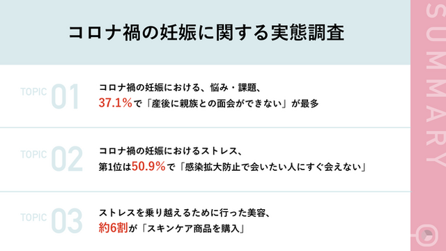 コロナ禍の妊娠中のストレス発散として、「スキンケア商品の購入」や「マタニティエステ」といった美容が一役買っています。まだまだ続くと想定されるウィズコロナ時代。なかなか気軽に外出できない、外出できたとしても人に会えないコロナ禍の妊娠中であるからこそ、自分一人で対応できる「美容によるストレス改善」に注目が集まりそうです。