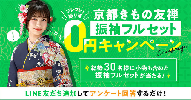 京都きもの友禅株式会社(本社:東京都中央区、代表取締役社長: 橋本和之、以下京都きもの友禅)は、2022年12月26日(水)から2023年3月31日(金)の毎月、LINEの友だち登録とアンケートへのご回答で、小物を含めた振袖フルセット一式、またはAmazonギフトカードが抽選で当たる「フレフレ!振り活」振袖フルセット0円キャンペーンを開催いたします。