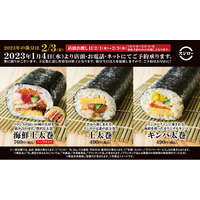 “すし屋の恵方巻”が今年も登場!10種のネタが入ったボリューム満点の「海鮮上太巻」に加え、定番太巻「上太巻」や「キンパ巻」の全3種が登場!