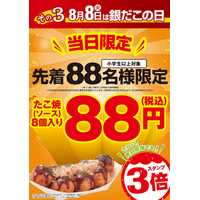 【今年も激アツ!】 8月8日(銀だこの日)は、先着88名※1、たこ焼1舟88円 !!