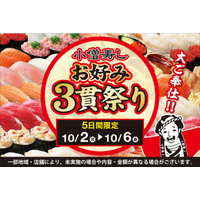 10月2日(月)~平日5日間限定!『お好み3貫祭り』開催!好きなお寿司を少しだけ食べたい人にもたっぷり食べたい人にも、うれしい人気フェアです!