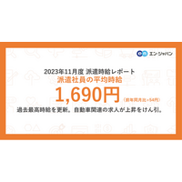 2023年11月度 派遣社員の平均時給は1,690円過去10年間で最高時給を更新。IT系、技術系にて、自動車関連の求人が上昇をけん引。
