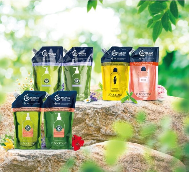 ロクシタンがCSR活動の一つに掲げる「地球の自然にやさしく」。その具体的な活動として、ヘアケアをはじめとする数々の製品で、通常ボトルに比べて約65~90%のプラスチックを削減できるエコレフィルの採用や、ロクシタン製品の空き容器(プラスチック・ガラス・アルミ)を全国の店舗で回収する「グリーンプログラム」など、地球の自然にやさしい活動を続けています。
