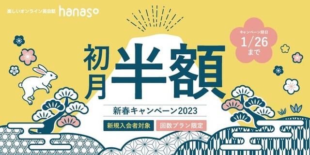株式会社アンフープ(所在地:静岡県富士市、代表取締役社長:重森 渉)がサイト運営する、無料通話ソフトZoomまたはSkypeを利用したオンライン英会話スクール「hanaso」では、2023年1月5日(木) ~1月26日(木)に、新規入会者を対象として回数プラン初月月額料金(4,400円~7,920円)(税込)が半額になる「新春キャンペーン2023」を実施いたします。
