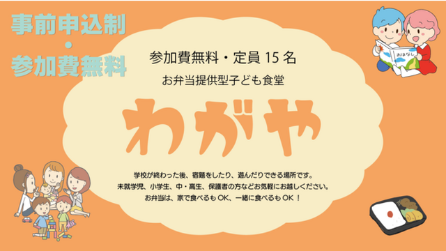 特例認定NPO法人兵庫子ども支援団体(所在地:兵庫県明石市、代表理事:多田実乘、以下「当法人」という)は、お弁当提供型のこども食堂「わがや」(以下、「本活動」という)を1月18日(水)より月1~2回開催いたします。本活動では、明石市の藤江小学校区に、学校が終わったあとの子どもたちが、宿題をしたり、遊んだり、夜ご飯を一緒に食べたりできる場所をつくります。